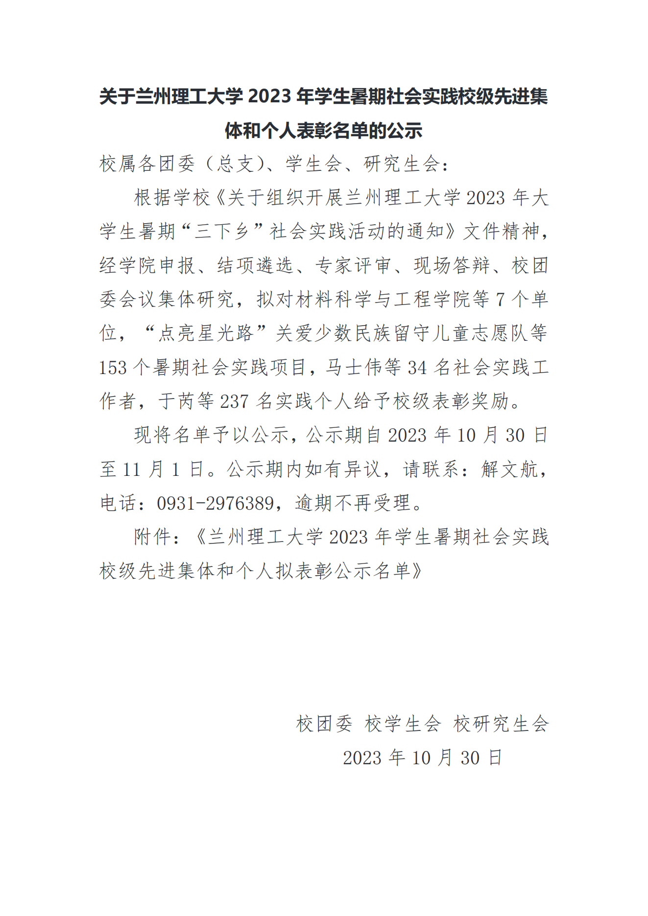 关于兰州理工大学2023年学生暑期社会实践校级先进集体和个人表彰名单的公示